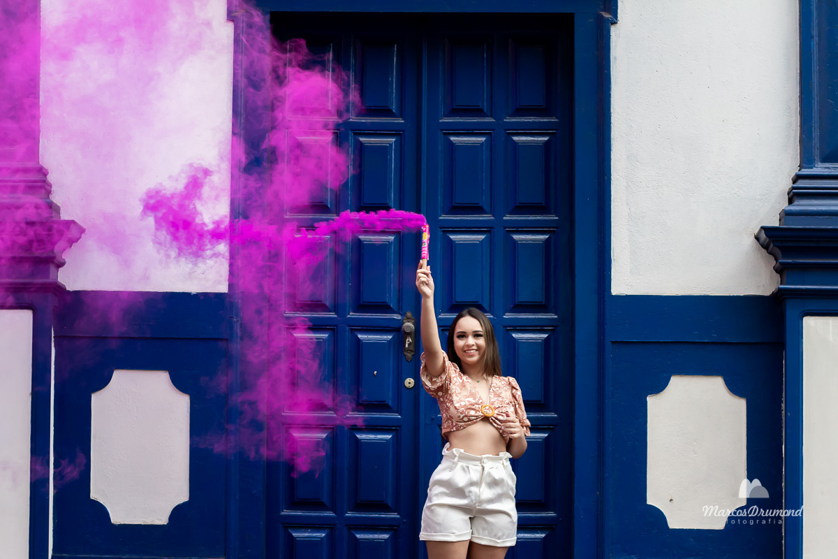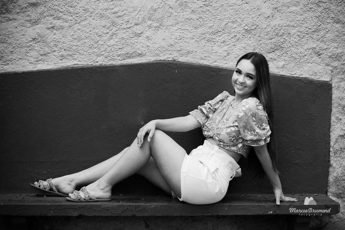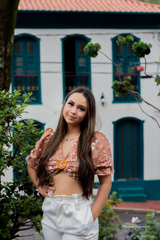 Fotografia de quinze (15) anos onde a debutante está próximo de umas flores sorrindo e olhando para as flores, o local é urbano e atrás dela tem um casarão antigo na cidade de Itabira/MG. Ela está usando blusa estampada, bermuda branca e rasteirinha.