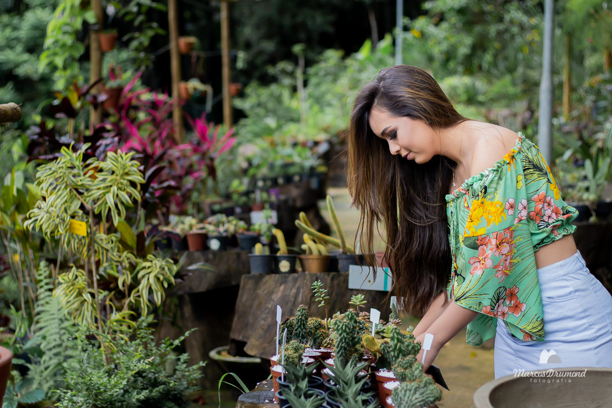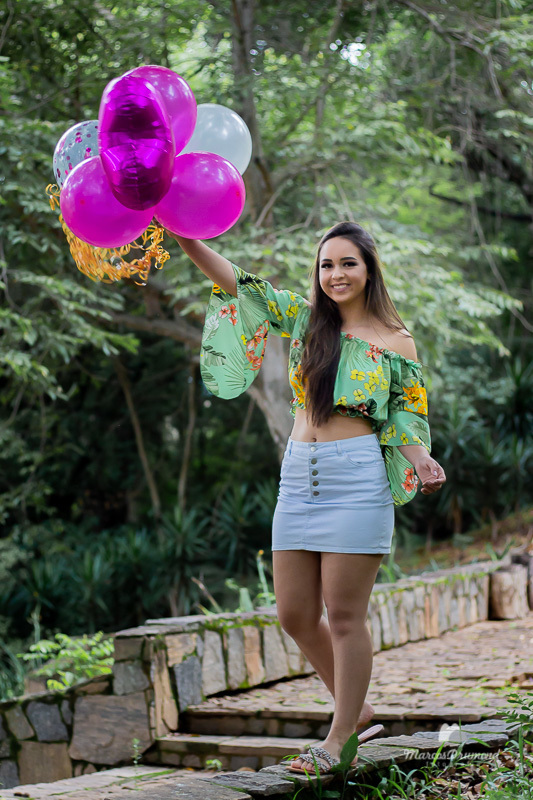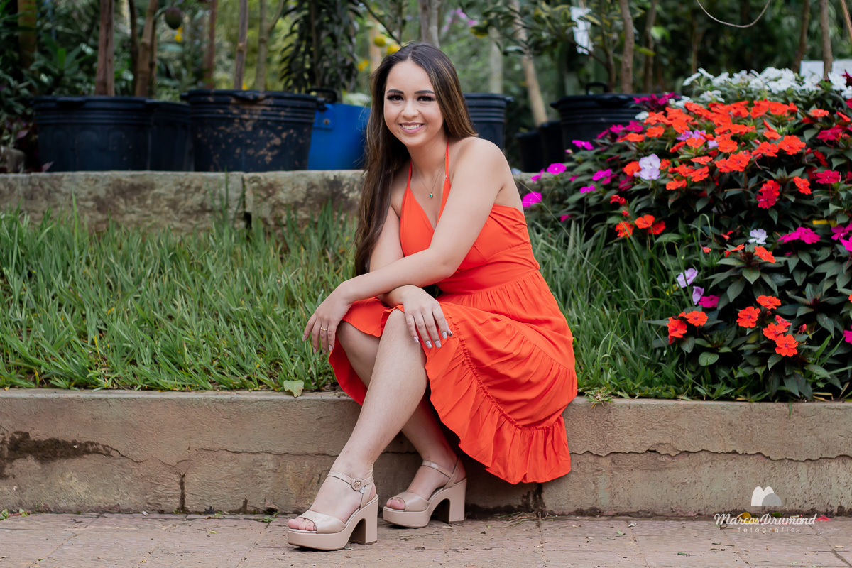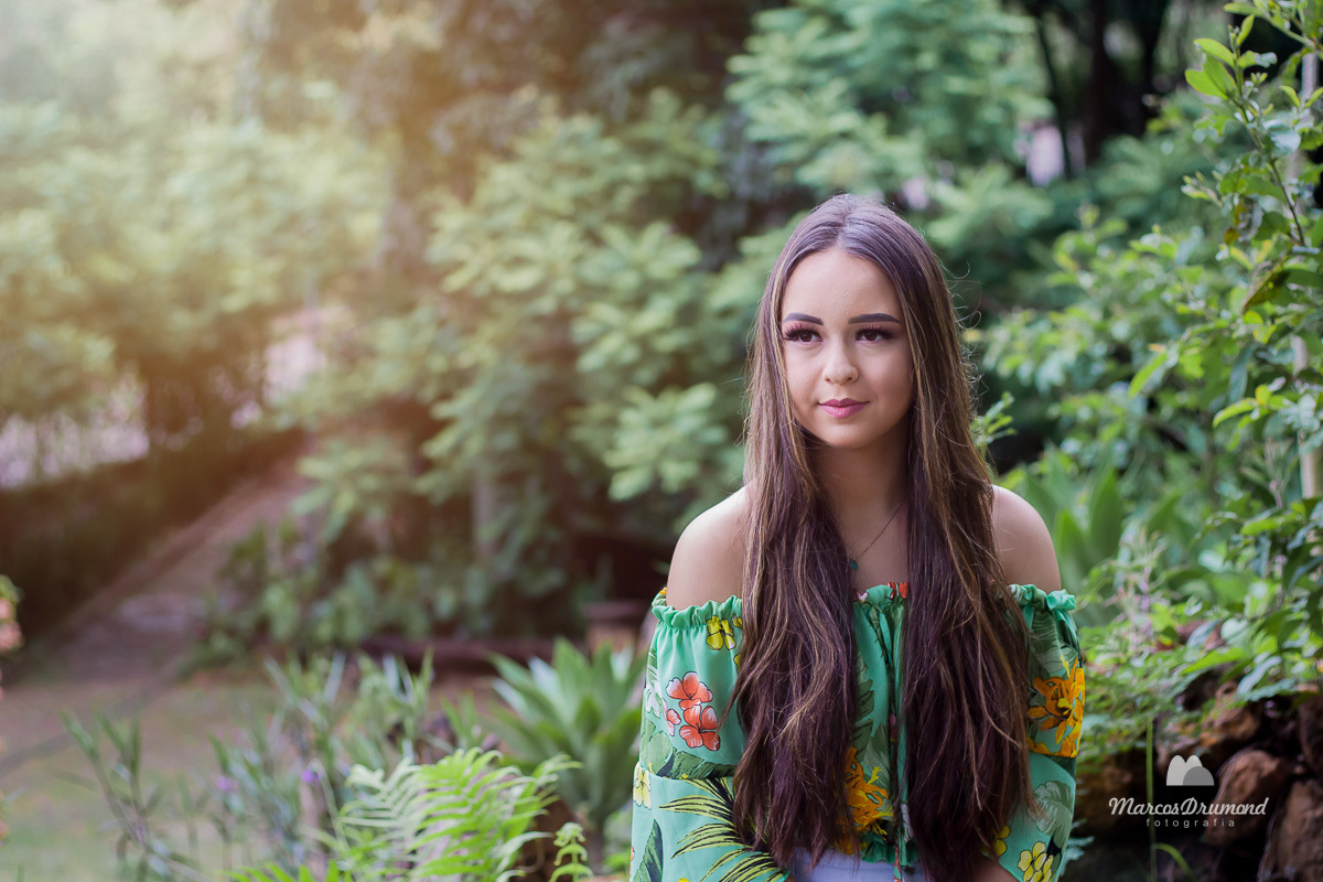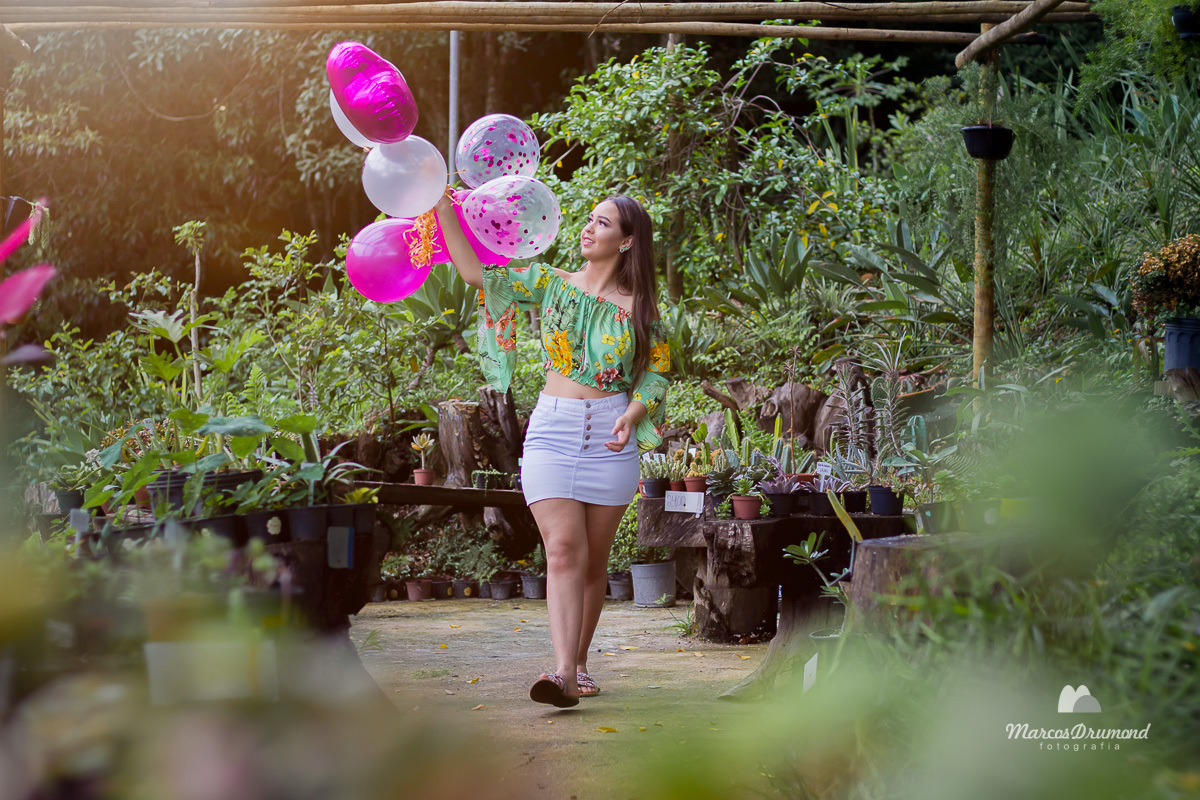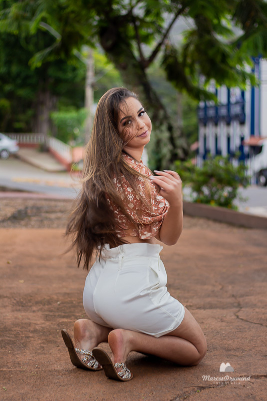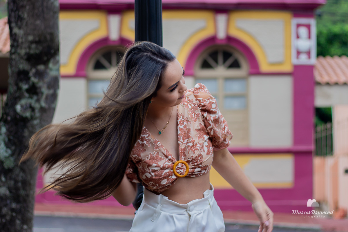 Fotografia de debutante na cidade de Itabira/MG no parque da Água Santa, onde a debutante está próximo ao portão de acesso ao parque e usando uma blusa florida marrom claro e uma bermuda short branco com uma rasteirinha e um cordão, com os cabelos longos