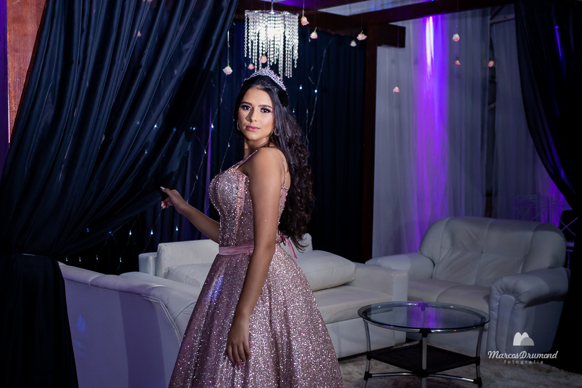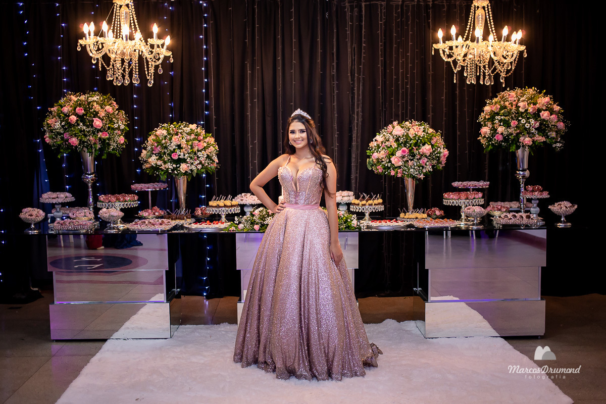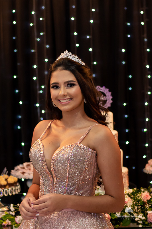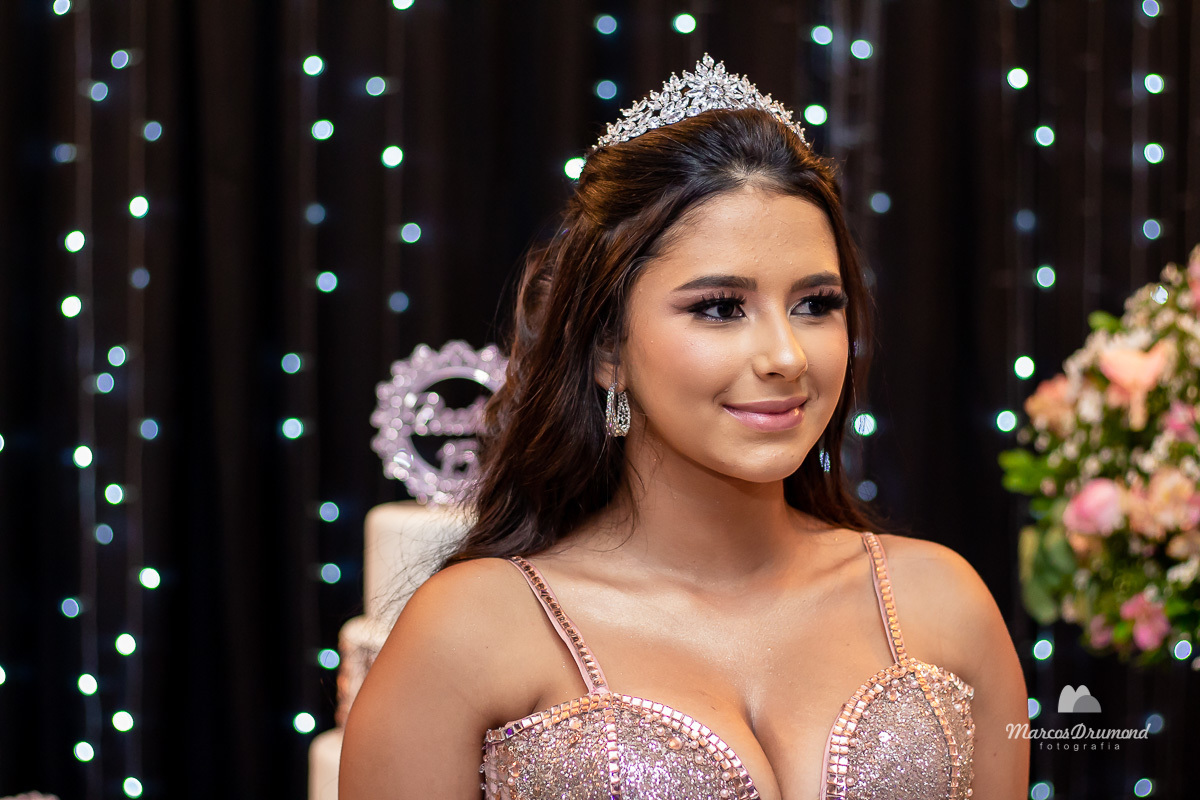 Fotografia de 15 anos da debutante Beatriz em Itabira MG, onde a mesma está cum as mãos próximo ao peito, olhando para o lado e usando brincos e coroa no cabelo próximo a mesa de bolo em sua festa, assim a mesma está comemorando muito feliz