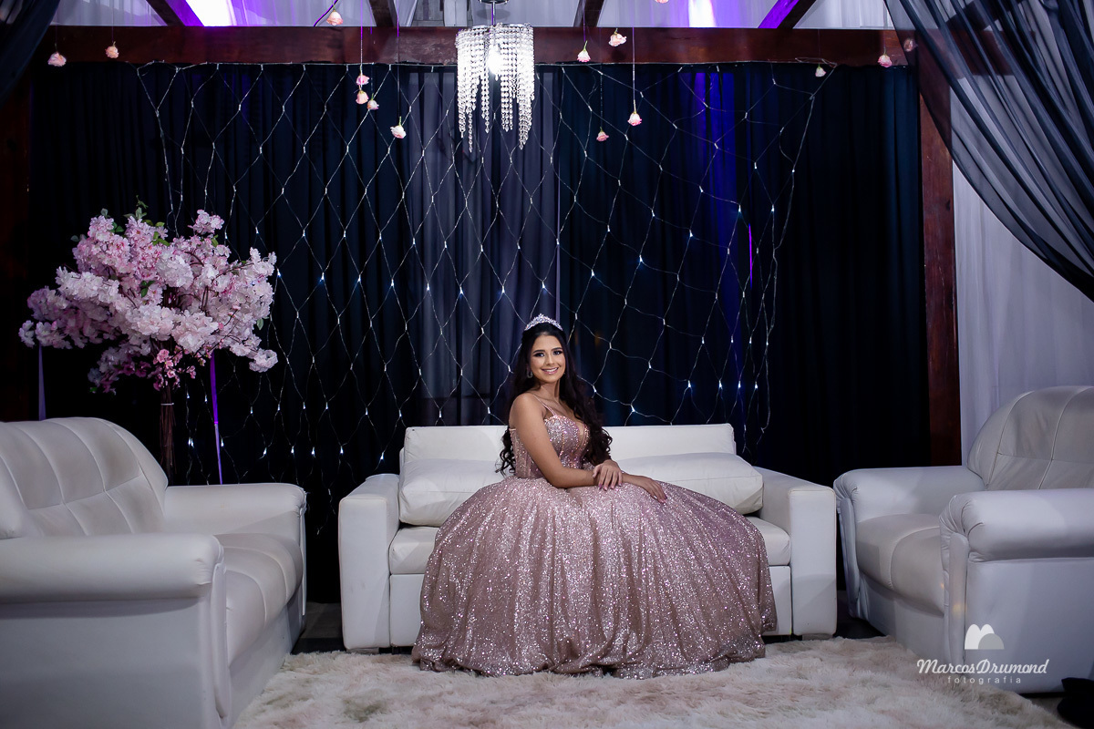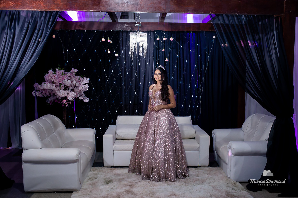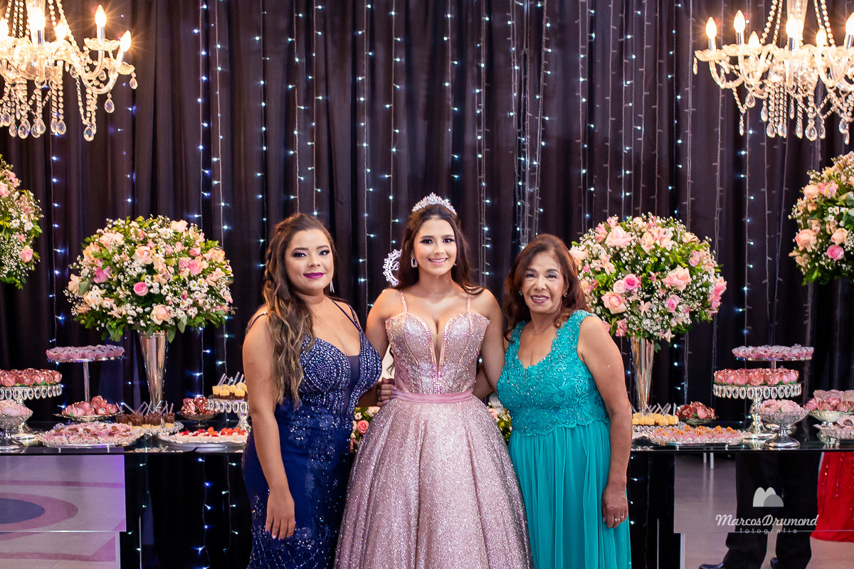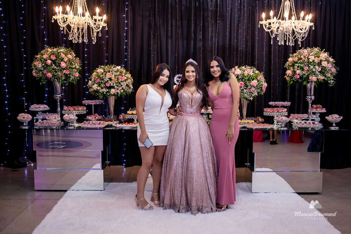 Fotografia de 15 anos da debutante Beatriz em Itabira MG, onde a mesma está cum as mãos próximo ao peito, olhando para o lado e usando brincos e coroa no cabelo próximo a mesa de bolo em sua festa, assim a mesma está comemorando muito feliz